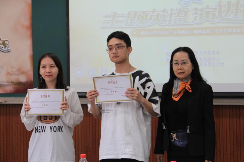 经过严谨的评判和细致的评分统计,本次比赛的结果正式揭晓。重庆大学-辛辛那提大学联合学院2019级机械专业本科生刘君晗和物理学院2020级电子信息专业本科生伊利达娜两位选手脱颖而出,荣获特等奖。法学院2020级法学专业本科生刘鉴剑和外国语学院2021级英语专业本科生邱滢佳荣获一等奖。外国语学院2021级翻译硕士胡婉仪,2021级英语专业本科生侯潇涵、黎珍妮、郭思雨、石昱欣,美视电影学院2021级戏剧与影视专业本科生邓靖妍等6位选手获得二等奖。法学院2020级法学专业本科生史欣瑶、外国语学院2021级英语专业本科生唐可一、博雅学院2021级中国语言文学专业本科生桑可、经济与工商管理学院2021级金融专业本科生鄂红豆、本科生院2021级电气信息类张城玮和艺术学院2020级艺术油画专业本科生甄瑱共6位同学获三等奖。随后,获奖选手们纷纷上台领奖并与诸位评委合影留念。