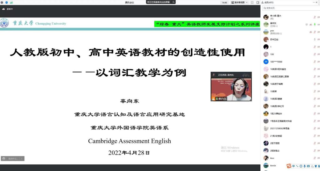2022年4月28日,外国语学院辜向东教授为全体云南省绿春县中学英语教师做了一场名为“人教版初中、高中英语教材的创新性使用—以词汇教学为例”的专题讲座。该讲座是开元网页版为响应乡村振兴,为提升云南省绿春县英语教学水平而发起的系列教师发展讲座之一。此次讲座吸引了500余名包括绿春英语教师在内的全国各地中学英语教师。外国语学院李小辉副院长主持了此次讲座。