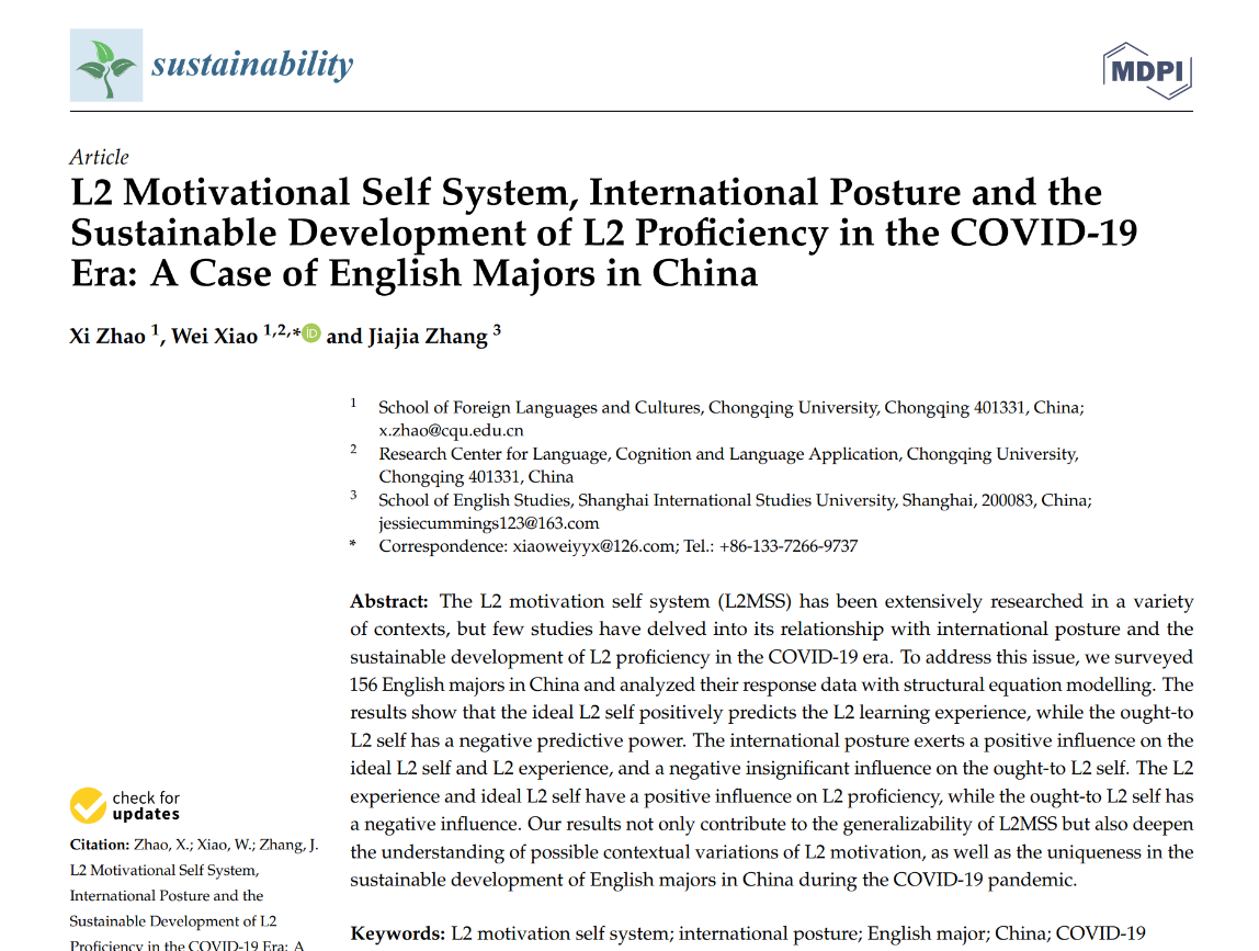 2022年7月1日,开元网页版副教授、语言认知及语言应用研究基地专职研究员肖巍博士指导本科生和硕士生撰写的研究论文L2 Motivational Self System, International Posture and the Sustainable Development of L2 Proficiency in the COVID-19 Era: A Case of English Majors in China于SSCI二区期刊Sustainability(影响因子3.889)在线出版。肖巍博士为论文通讯作者,合作者为其指导的本科生张家佳(现于上海外国语大学英语学院读研)和研二硕士生赵曦。DOI: 10.3390/su14138087
