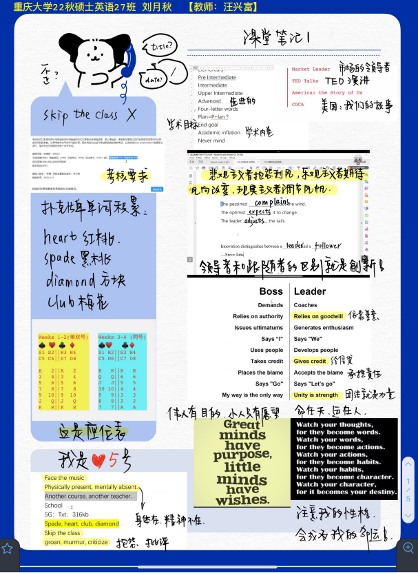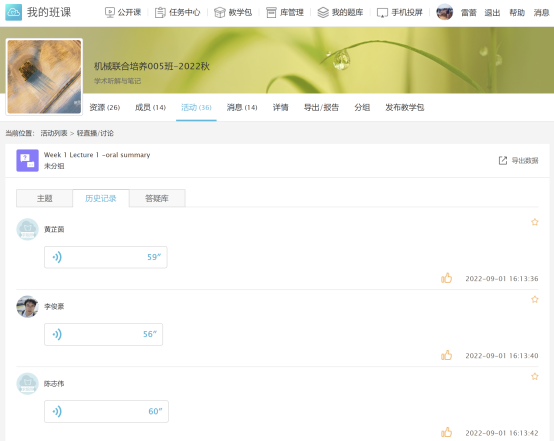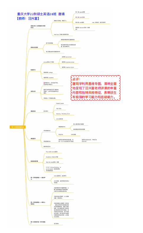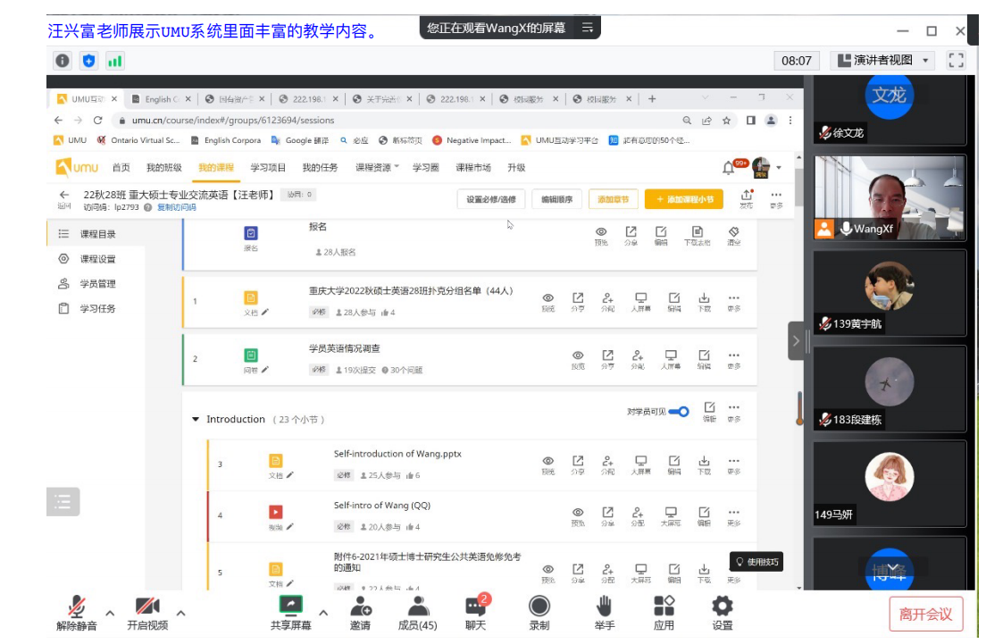 在重庆大学公外研究生专业交流英语课程教学中,汪兴富老师利用优秀的UMU教学平台,将Market Leader中高级教材、优秀的TED演讲、纪录片America: the Story of Us、以及COCA语料库资源4大主要内容整合成200多个学习小节或资源微课,以问卷、文档、视频、拍照、讨论、图文、作业、考试等多种类型编制出一个系统性的课程。上课采取间插拓展方式训练学生的语言能力,全面培养懂Communication,Cultures,Collaboration,Creativity,和Critical Thinking的5C能力的新时代研究生。并充分利用UMU平台积分规则调动学生学习积极性,向优秀同学学习。该课程的安排计划明确,课时的任务清晰明了,考核方式多元化,充分兼顾学生平时学习情况与最终考核成绩。