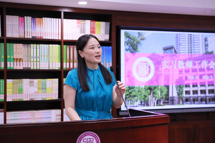 巴蜀中学学生处副主任刘会兰、教师发展中心主任万宇就实习要求作了发言。刘会兰老师强调,实习教师要重点学习学科知识与班主任工作两个方面的内容,同时对寝室的相关管理和制度做了详细说明。万宇老师就“如何受人尊重”问题提出五条建议、三点希望。她嘱托实习教师要珍惜时光、加紧学习,在巴蜀中学这片沃土上更好地成长。