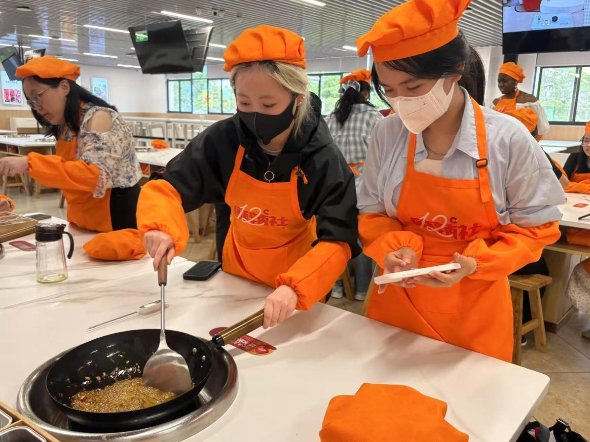 "课堂上我们讨论过火锅的国际化问题,今天亲眼见到'李氏辣度'分级系统以及德庄的现代化生产工艺,才真正理解非遗技艺如何与现代科技结合。"参与调研的怡佳同学表示。在互动体验区,同学们亲手尝试手工炒制火锅底料,将课堂知识与实践操作有机结合。