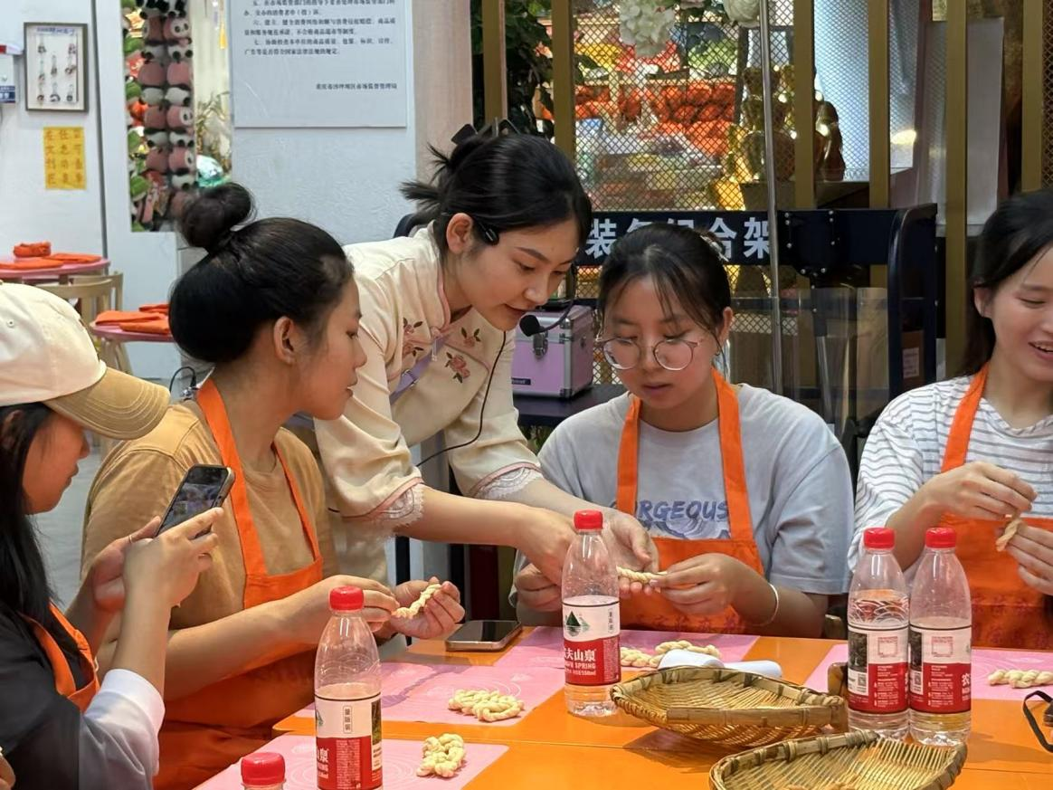 7月3日,调研团队来到课程第二站——磁器口古镇的陈昌银麻花博物馆。此前课堂已专题研讨过传统小吃在城市化进程中的保护问题。实地探访中,同学们不仅观摩了麻花制作全流程,更在传承人指导下体验手工搓制工艺。