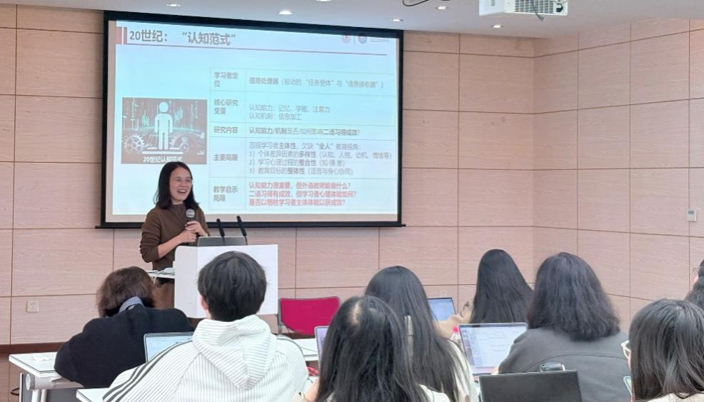 讲座中,李教授系统回顾了二语习得研究从“认知范式”、“心理拓展范式”到积极心理学视域下“个体优势范式”的演变,并剖析了传统研究范式的局限。她指出,过往研究往往忽视成功学习者的积极特质、学习者的心理健康与幸福感,以及个体与环境的复杂交互作用。为此,李成陈教授创造性地提出,应在积极心理学视角下对二语习得研究进行范式重构,倡导建立一种以“语言发展”与“个体幸福”为平行目标、充分发掘个体与环境优势的“积极语言教育观”,她呼吁未来研究向此方向转型,并指出了教学与研究相结合的具体路径。