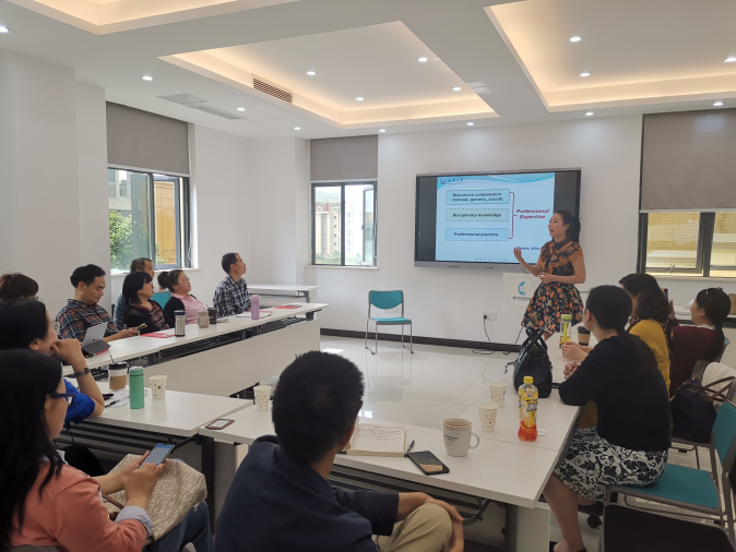首先,李雁老师对研究生公共英语课程体系发展和完善的三个阶段进行了梳理,介绍了课程组在黄萍教授的引领下,基于专门用途英语课程设计理念,从传统的《研究生基础英语》课程转型为满足国际化人才培养核心需求的《国际学术交流英语》、《专业交流英语》、《跨文化交际英语》三大主要课程模块,同时积极创建基于人才培养个性化需求的《影视体验英语》、《艺术与文化交流英语》、《新闻传媒交流英语》等特殊用途英语课程,并提出了以培养学生语言能力、思维能力、国际学术交流与专业沟通交流能力、跨文化交际能力的创新课程总目标,以及构建分层次、分类别、多样化、有特色的硕博英语课程体系的发展规划。李雁老师鼓励课程组老师在当前“双一流”建设背景下,努力深化现有课程的教学改革实践,积极开展创新型特色课程的创建,并且尽力为研究生英语学习与实践提供强有力的支撑与指导。