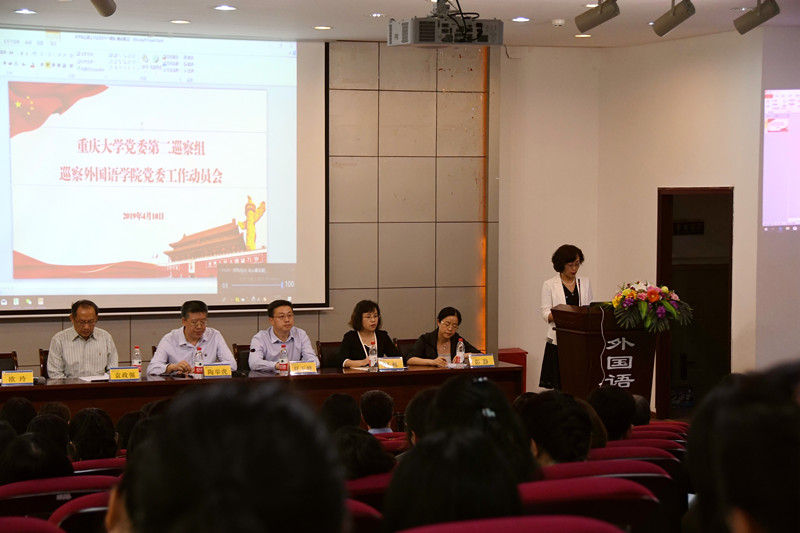 根据学校党委巡察工作领导小组统一部署,2019年4月10日下午,学校党委第二巡察组巡察外国语学院党委工作动员会在外语学院楼二楼多功能厅召开,学校党委副书记、纪委书记、校党委巡察工作领导小组组长陶举虎同志出席会议并讲话。外国语学院院长彭静同志主持会议,外国语学院党委书记欧玲同志作表态发言。