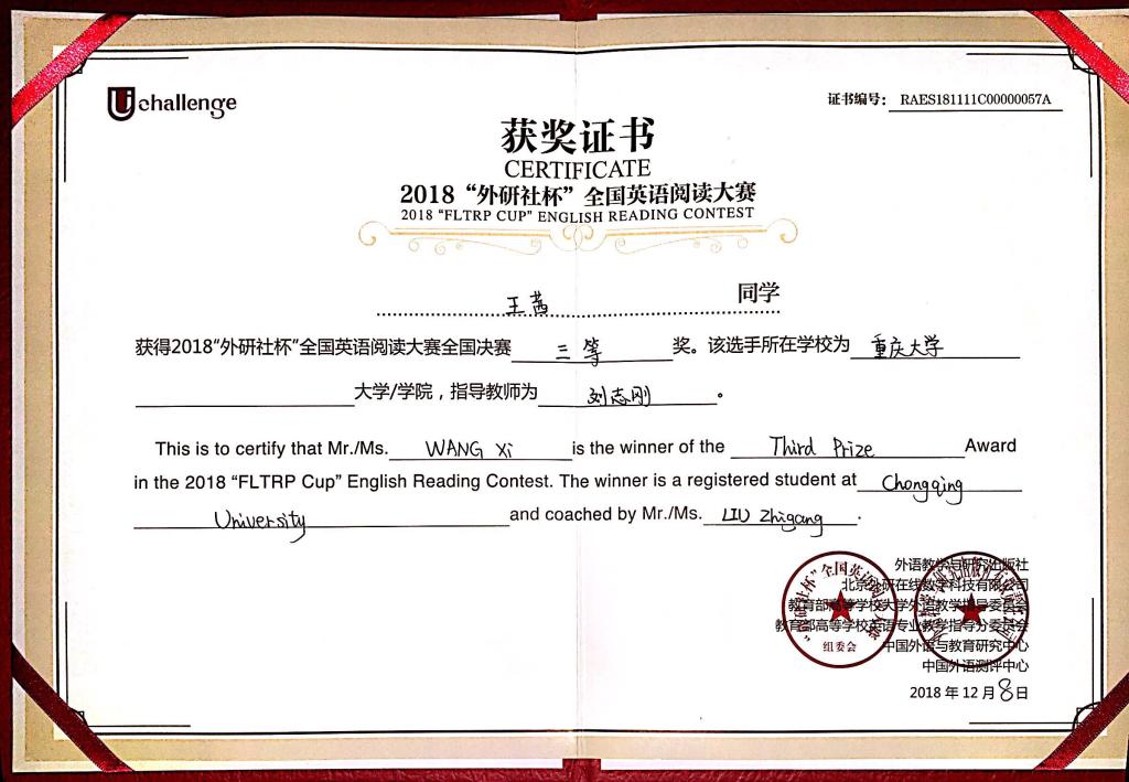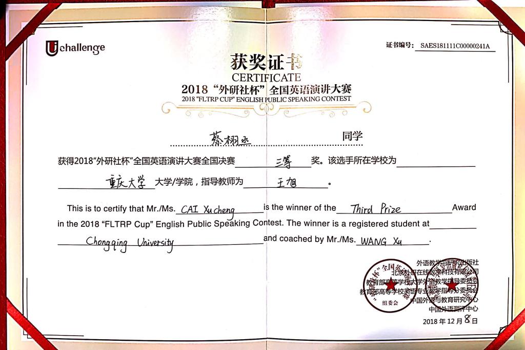 2018年12月9日,“外研社·国才杯”全国英语演讲、写作、阅读大赛总决赛在北京落下帷幕。来自全国30个省、市、自治区和香港、澳门特别行政区以及多国在华留学生共193名,分6个场次展开激烈角逐。我校两名选手从激烈的省赛中脱颖而出,代表重庆市参加了本次总决赛,其中城市建设与环境工程学院的蔡栩丞以其细腻的表达、缜密的思维、新颖的角度和独特的台风荣获演讲比赛全国三等奖,王旭获得指导教师三等奖;外国语学院的王茜荣获阅读比赛全国三等奖,刘志刚获得指导教师三等奖。