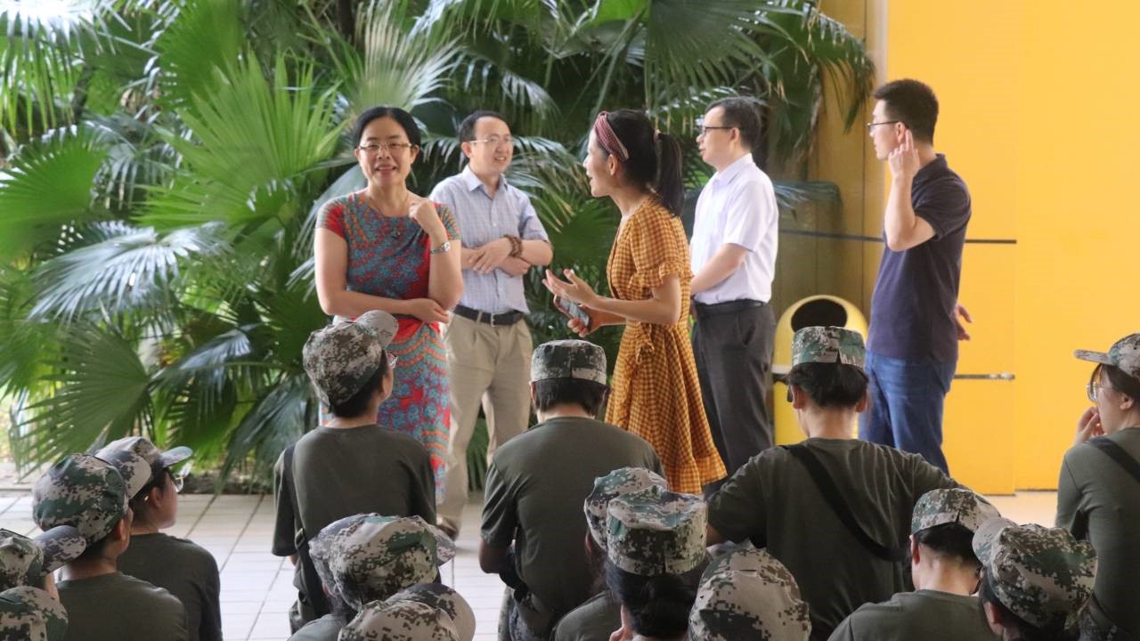 在等待训练继续进行的间隙,彭静院长还向简单介绍了将会在军训阶段结束后进行的学习规划工作,就新生的学业方面提出了一些要求。她还希望大家在军训之余开始进入外语专业的学习状态,为接下来的专业知识学习做好充足准备。