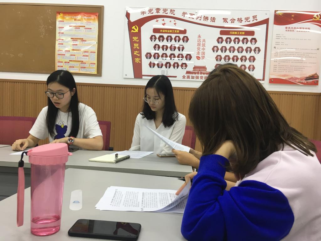 2019年9月18日,外国语学院翻译硕士党支部在学院楼105会议室开展了“深学笃用新思想”主题党日活动。游振声老师、翻译硕士党支部全体党员参与了此次会议,会议由党支部副书记段欣宜同志主持召开。