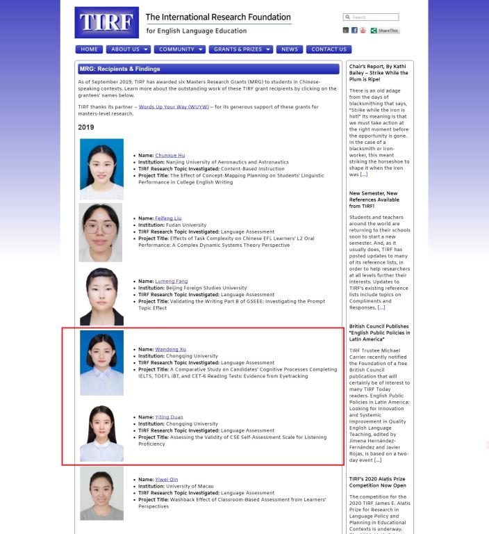 2019年9月24日,首届“国际英语教育研究基金会硕士研究基金奖”(The International Research Foundation for English Language Education, Masters Research Grants, TIRF MRG)获奖名单正式揭晓。此次共计六名获奖者,我院辜向东教授指导的两名团队成员,2017级硕士研究生许皖栋和段奕霆分别获得2500美元和2000美元的硕士研究基金奖。两位同学此次获奖的硕士研究题目分别为:《雅思、托福、大学英语六级阅读测试考生认知过程的对比研究:来自眼动的证据》(A Comparative Study on Candidates’ Cognitive Processes Completing IELTS, TOEFL iBT, and CET-6 Reading Tests: Evidence from Eyetracking)以及《中国英语能力等级量表听力能力自评量表的效度验证》(Assessing the Validity of CSE Self-assessment Scale for Listening Proficiency)。