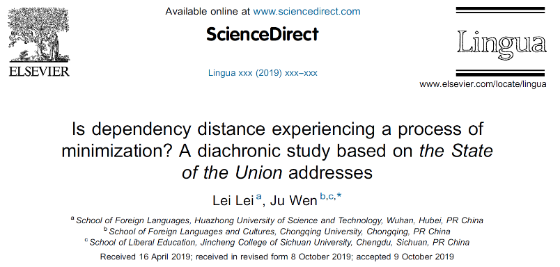 Lei, L. and Wen, J. (2019) Is dependency distance experiencing a process of minimization? A diachronic study based onthe State of the Unionaddresses, Lingua. doi:https://doi.org/10.1016/j.lingua.2019.102762.