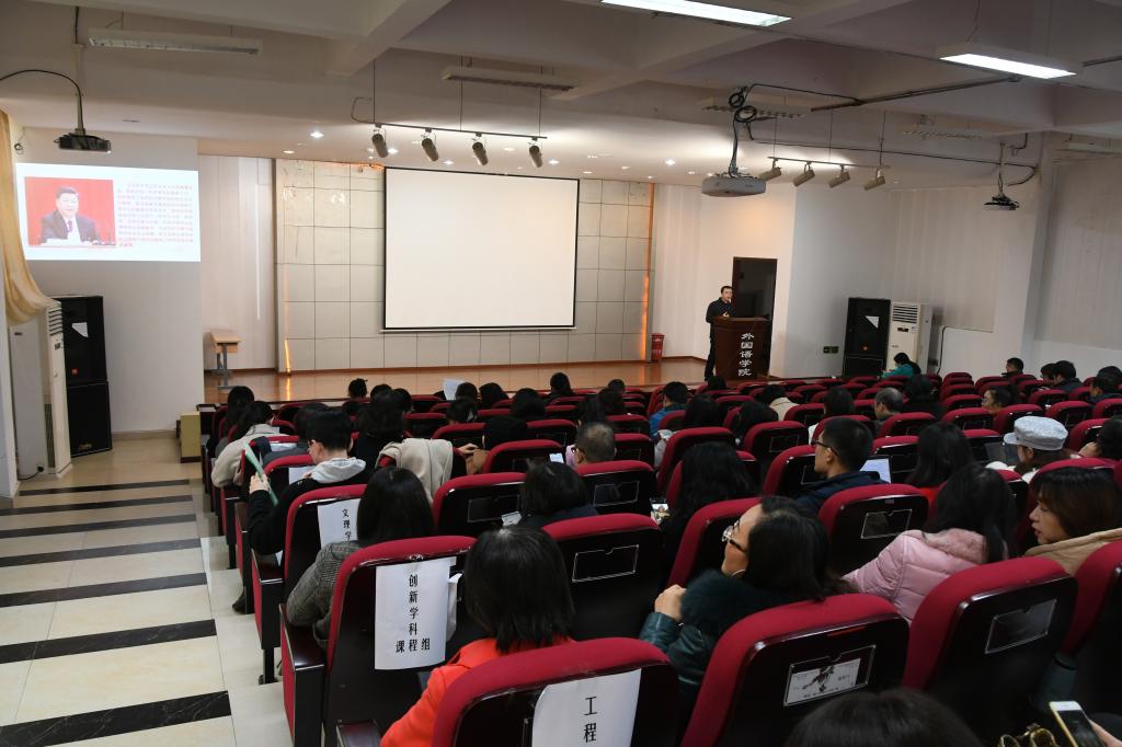 2019年12月12日下午,外国语学院党委邀请学校党的十九届四中全会精神宣讲团成员、马克思主义学院党委副书记温健琳博士为全院教职工进行了党的十九届四中全会精神宣讲。会议由学院党委副书记魏世平主持,学院领导班子、党委委员、纪委委员和全院教职工参加了学习。