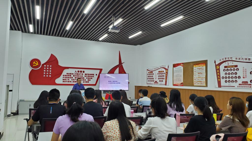 为庆祝中国共产党成立99周年,积极响应教育部在常态化疫情防控中加强高校基层党建“四个一”行动号召,2020年7月6日上午,在外国语学院105党员活动室,学院党委魏世平副书记讲了一堂以《我骄傲,我是中国人——从抗疫看中国之治的优势》为题的精彩微党课,学办辅导员、本科生支部全体预备党员参加了学习。