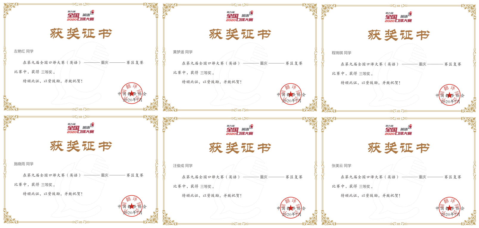 2020年7月8日,由全国口译大赛(英语)赛事方官方发布的消息显示,我校11位同学在2020年6月21日参加的第九届全国口译大赛(英语)重庆市复赛中喜获佳绩,其中5位同学成功晋级第九届全国口译大赛(英语)西部大区赛。据悉,本次大赛由中国翻译协会主办,共有来自重庆市10余所高校的67名选手参赛,排名前46.2%的选手晋级大区赛。同时,由于受到疫情诸多防控因素的影响,大赛采用网络比赛方式,赛事结果也于近日才公布。
