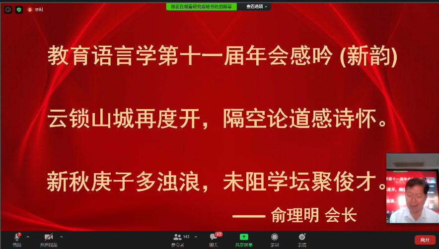 最后,中国英汉语比较研究会教育语言学专业委员会会长俞理明教授致闭幕辞,代表中国英汉语比较研究会教育语言学专业委员会对年会取得圆满成功表示祝贺,对开元网页版团队、各发言专家教授、上海交通大学外国语学院团队,华东师范大学出版社以及所有参会的老师同学们表示衷心的感谢。随着闭幕式的结束,俞会长献上专为此年会写作的的诗作为大会画上了圆满的句号。
