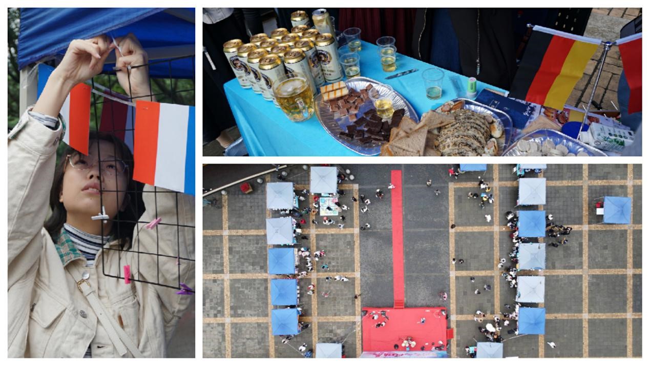 舞台节目表演的同时,各个展棚的游戏也如火如荼地开展着。日本展棚准备了许多食材供同学们现场制作寿司;韩国展棚前的韩舞表演整齐划一、时尚有力;法国展棚的插花体验吸引众多同学前去参加;俄罗斯展棚准备了切成小份的大列巴面包和香肠,并邀请同学们前去体验套娃绘画。巴西展棚、意大利展棚、印度展棚、澳大利亚展棚、美国展棚、德国展棚、墨西哥展棚、英国展棚等也准备了许多有趣的文化体验活动和丰厚的奖品。在十二国文化展棚中,同学们体验了丰富的文化活动,拓展了视野,收获了美好的午后时光。