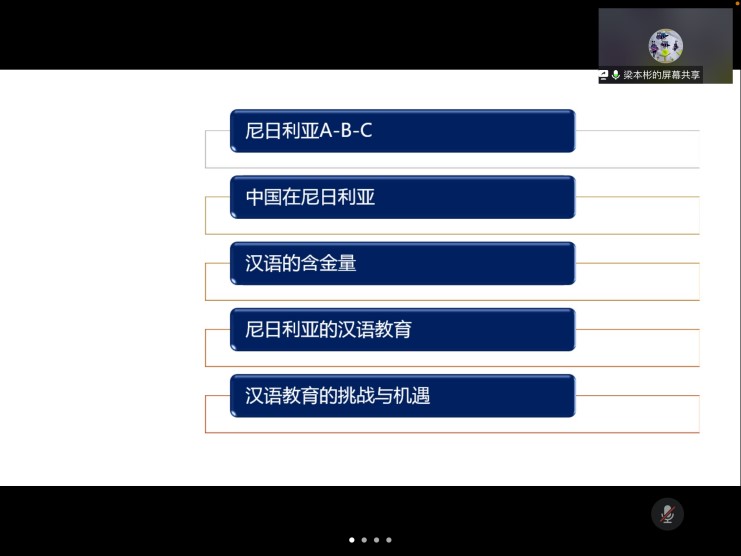 基于以上介绍,梁本彬先生分析了中文教育在尼日利亚的发展情况和受到的挑战。目前,尽管尼日利亚人学习汉语的热情较高,但是汉语在尼日利亚外语教学中地位偏低,尼日利亚现有两所大学设立了孔子学院。尼日利亚的汉语教育主要是由国家汉办层面引领的,因此汉语教育缺乏本土造血功能。同时,受制于疫情和治安情况,中国汉语教师前往尼日利亚的意愿较低。然而,挑战也是机遇,尼日利亚的汉语教育还有很大的发展空间和潜力。此外,梁先生也对对外汉语教师的素质提升提出了自己的期望,汉语教师应该还要有做文化使者和文化践行者的觉悟。