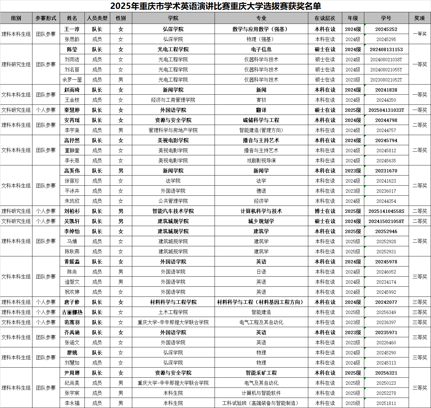 比赛结果公布丨2025重庆市高校学术英语演讲大赛校选赛
