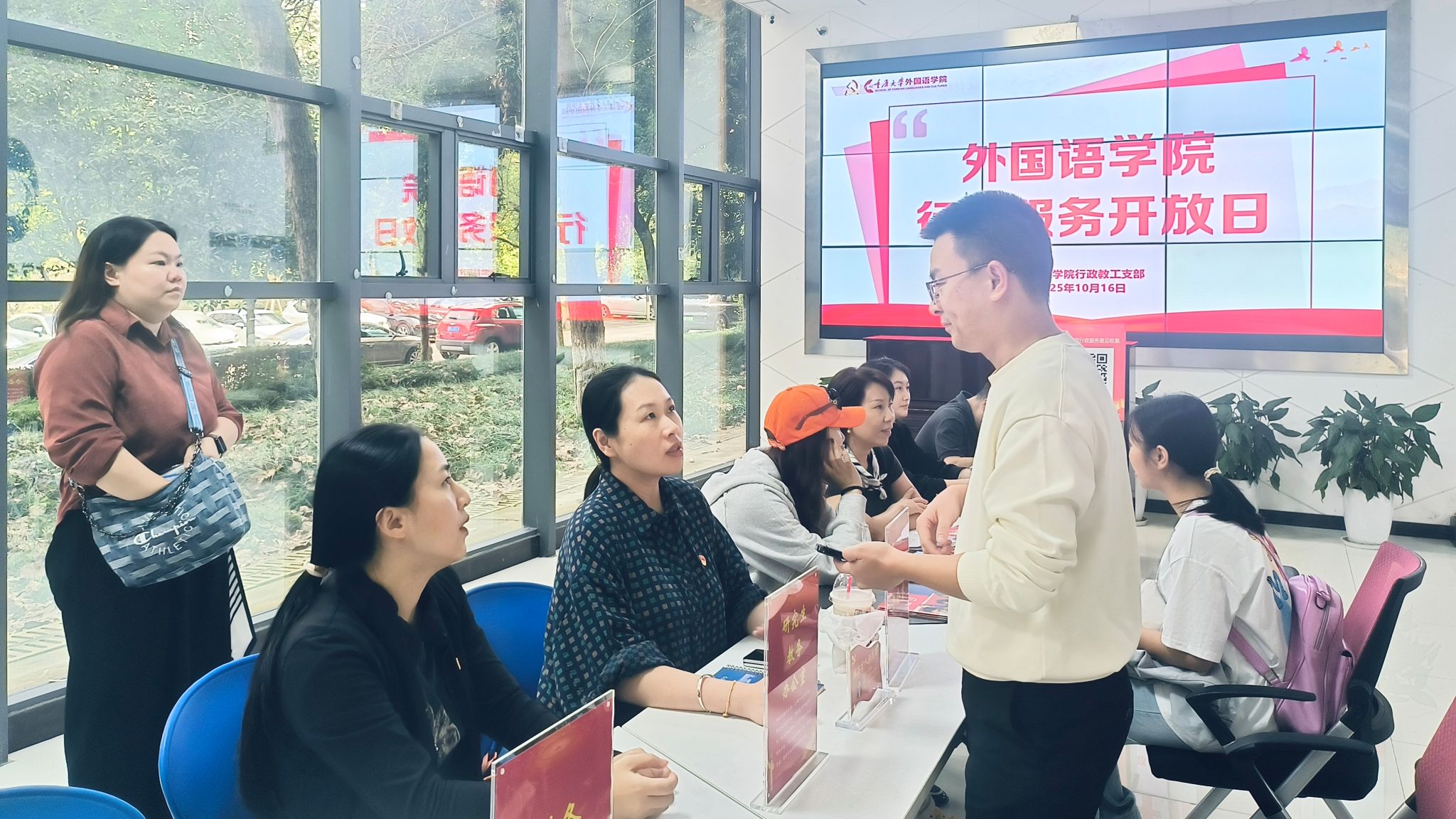 为加强师生沟通,提升行政服务效能,外国语学院行政教工党支部于10月16日下午举办“行政服务开放日”活动。此次活动旨在搭建一个学生与学院行政各科室直接沟通的平台,面对面解答学生的各类疑问,直观展示学院资源与服务,帮助学生更高效地解决在学习和生活中遇到的实际问题。