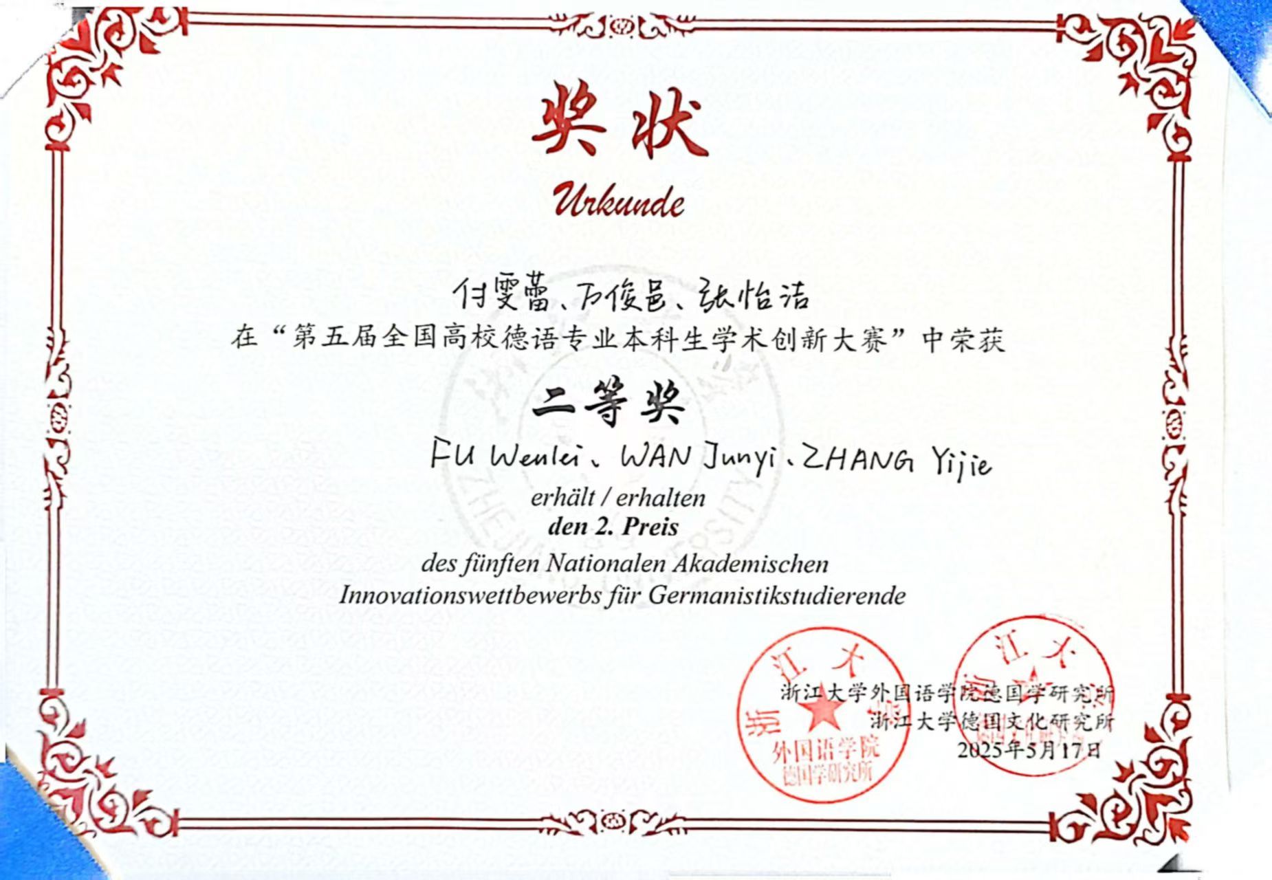 2025年5月17日,第五届全国高校德语专业本科生学术创新大赛决赛在浙江大学紫金港校区成功举办。本次大赛由浙江大学外国语学院德国学研究所和德国文化研究所联合主办,吸引了全国多所高校的德语专业本科生参赛。我校代表队由2022级德语专业本科生付雯蕾、张怡洁和万俊邑组成。在比赛中,三位同学凭借扎实的专业知识、创新的学术思维和出色的团队协作能力,荣获全国二等奖。