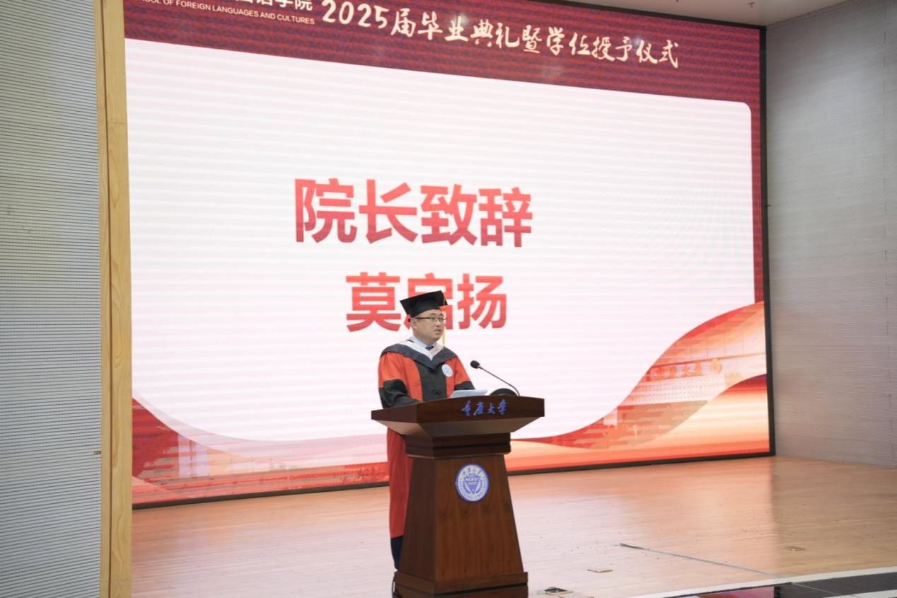 院长寄语,三颗莲子表深情。莫启扬院长以饱含深情的致辞为毕业生送上祝福与嘱托。他回顾了同学们在疫情和人工智能浪潮中的坚韧成长,并赠予三颗精神莲子:“破”——勇敢打破语言、文化与思维的壁垒,以专业与批判精神刺破偏见;“立”——在全球语境中立定精神根基,追求卓越,成为连接中外的桥梁;“传”——传承文明火种,传递真实声音,推动人类命运共同体建设。毕业是新起点,愿同学们带着这三颗精神莲子扬帆起航,“外国语学院永远是你们的家”。