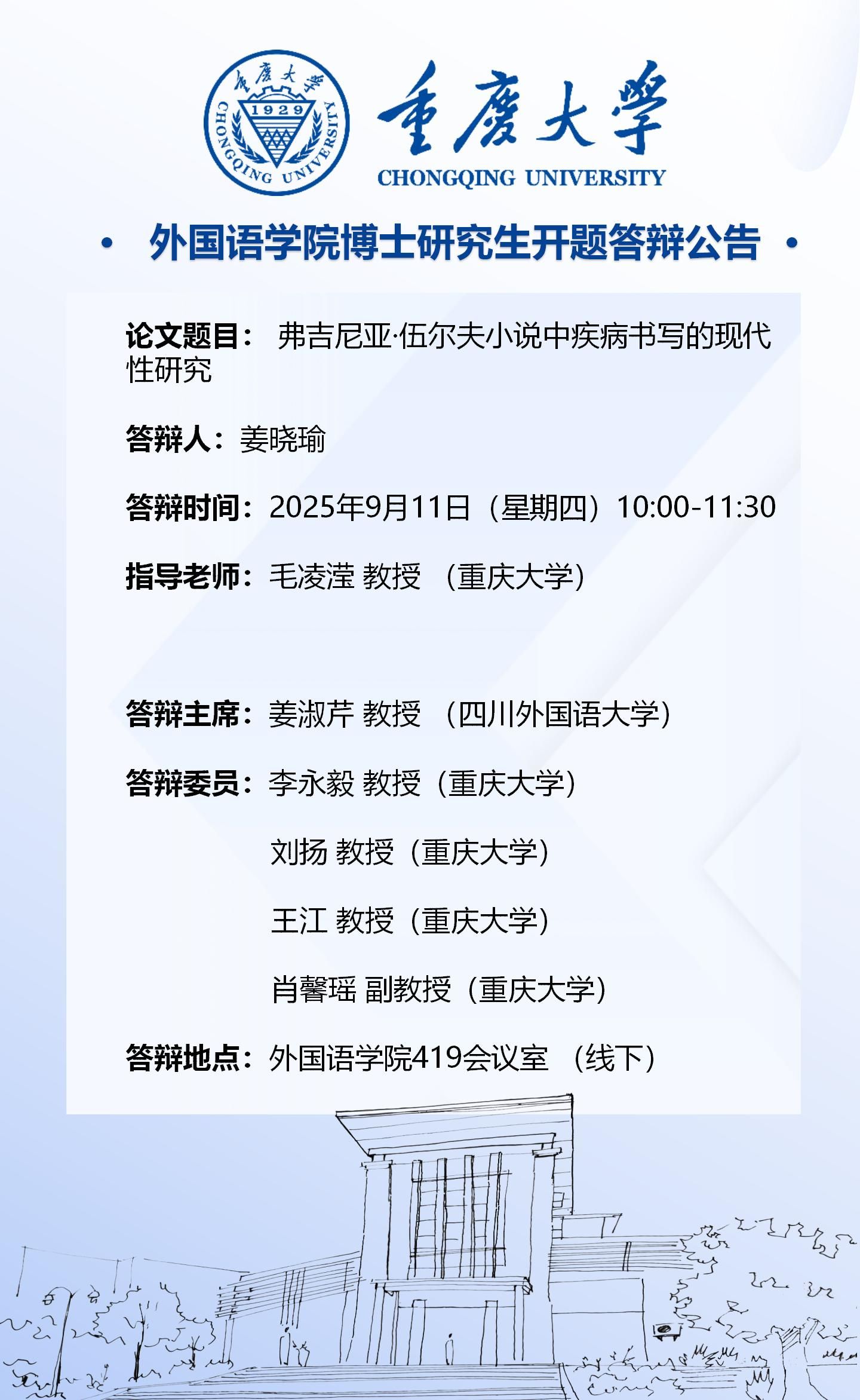 外国语学院2022级外国语言文学专业(文学方向)博士开题答辩将于2025年9月11日进行,答辩安排见附件。